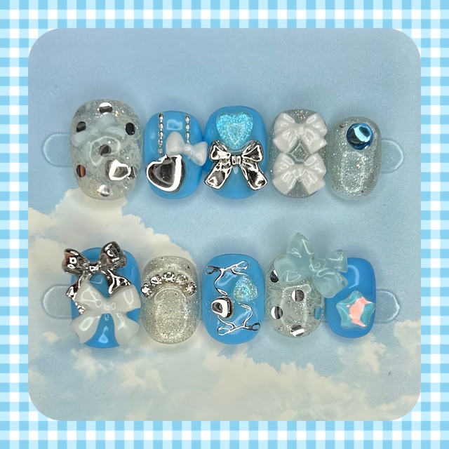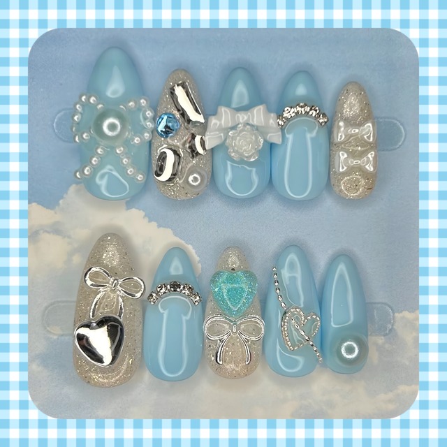 アーモンド形で水色はレア♡ 甘くなりすぎないように、大人ぽく仕上げました.ᐟ.ᐟ サイズ:5 形:アーモンド カラー:10 付属品:ネイルチップ10枚1セット、ネイルチップ用粘着シール1セット分、着用手順が記載されているカード ご購入前に... 『ご購入前に一読ください』をご覧ください